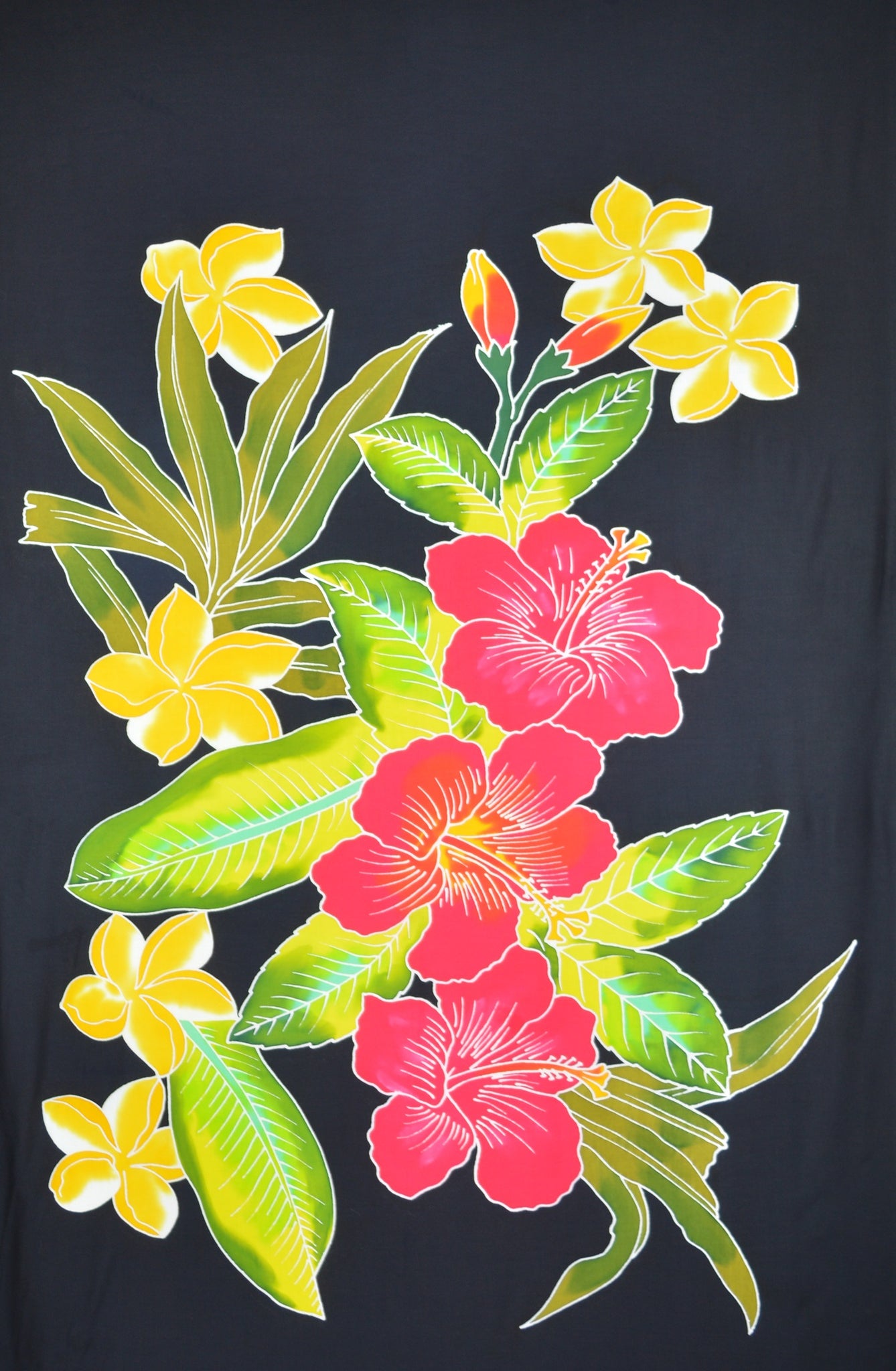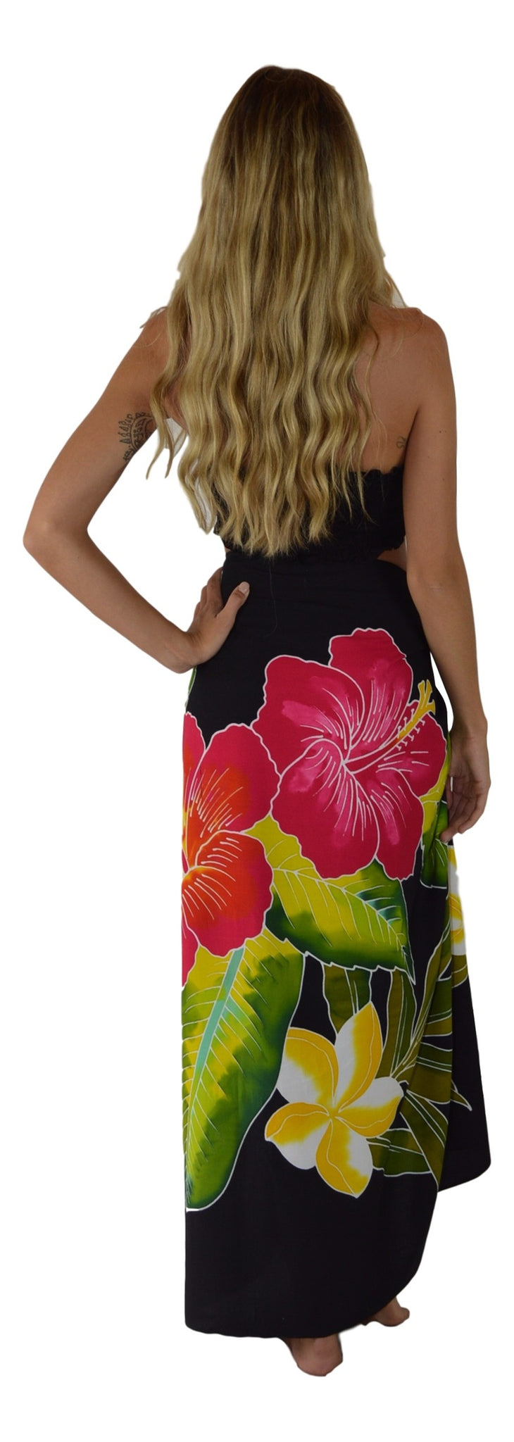 Keywords: sarong, batik, hand painted, Hawaiian Hibiscus, black, floral sarong, rayon, pareo, women’s beachwear, one size, resort wear, handmade, bali, wholesale